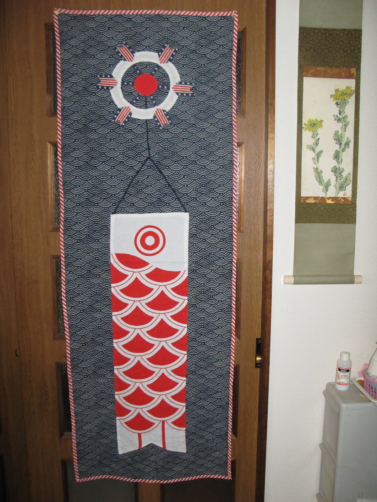 It is very old. Made from a tenugui in an age where we had a big house with a huge dining room table. It is even older than my paper diary so has never been added to the story of my quilts. From May 1 to May 5 is just too short exposure for a carp that has been hiding on a closet shelf for eleven months!