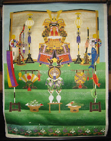 It was then called Boy's Day and some of the display, like screens made from arrows standing in a wooden frame, Samurai armour, carp streamers and weaponry had belonged to my husband when he was a child. This printed banner has Girl's Day decorations on the back and is a lot easier to take out and set up. Maybe I need to make a quilted version . I do have a printed carp table runner somewhere.